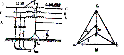 下面以變壓器高壓侵入低壓為例來分析接地電網的安全性。設高壓10kV,低壓0.4kV(見圖2-17a),盡管高壓相線對地電壓將近為5800V,但當高壓側意外與低壓側發生短路時(圖中是與低壓中性點短路),由于10kV是不接地電網,單相接地電流Iad不超過20~30A,如能控制RN≤4Ω,即可限制低壓中性點對地電壓UN不超過80~120V。若變壓器為Y/Yo-12接法,可由電壓矢量圖(圖2-17b)求得各相對地電壓,a相和b相為269~299伏、c相為140~100V。