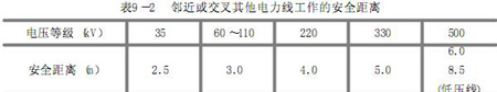 此種鄰近帶電線路進行檢修時,除必須嚴格遵守停電許可和驗電接地規定以外,并須嚴格執行以下規定事項:①施工人員事前必須人人明確線路的桿型和哪一路帶電,哪一路停電,到達現場后,應認真核對停電檢修的線路;登桿人員在登桿時,只準從停電線路一側登桿,不準從帶電一側登桿。②登桿工作應設專人在地面監護。③登桿人員必須思想集中,應與帶電體保持足夠的安全距離,如表9-1所示。④雙回路桿上吊物應使用無極繩索不使飄蕩或用絕緣繩索。