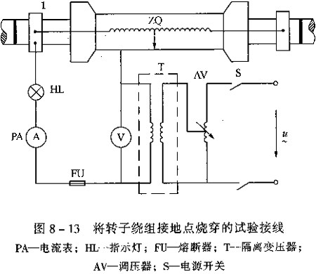 如需將轉子繞組較高的接地電阻通過燒穿試驗變成較低的穩定接地電阻,可按圖8—13所示試驗接線進行。圖中:電流表PA用作監視燒穿接地點電流;燈泡HL用作限流和在燒穿時發亮信號;熔斷器FU用作保護,以免電流持續時間過長,燒壞轉子部件。