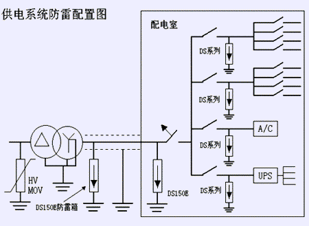 12、重要用電設備(如UPS﹑整流器﹑高頻開關電源﹑精密空調等)的交流進線端也根據其容量用不同型號的電源避雷器(DS150E-DS44或LA60-B-V20C/2)。