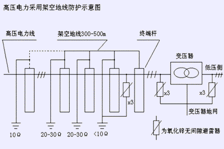 為確保安全,宜在避雷線終端桿的前一桿上,增裝一組氧化鋅避雷器。若已建站的架空高壓電力線路防雷改造采用避雷線有困難時,可在架空高壓電力線路終端桿﹑終端桿前第一﹑第三或第二﹑第四桿上各增設一組氧化鋅避雷器,同時在第三桿或第四桿增設一組高壓保險絲。避雷線與避雷器的接地體宜設計成輻射形或環形。
