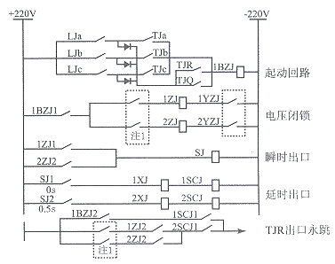 由于失靈保護瞬時出口跳閘的時間與TJa、TJb、TJc經分相操作箱出口跳閘的時間相差不多,當線路開關切除故障時間較長時,失靈保護瞬時跳閘回路可能出口。由于失靈保護瞬時跳閘回路出口,在運行中暴露出兩個問題:一是寧夏電網220 kV線路投的是單相重合閘,當線路發生單相瞬時性故障時,由于失靈保護瞬時出口跳三相,造成開關不能重合,例如,青銅峽變、銀川變各有1次在線路故障時,失靈保護瞬時出口信號掉牌;1999年7月27日,220 kV青坡線發生C相接地故障,開關約110 ms將故障切除,同時五里坡變失靈保護瞬時出口信號掉牌,五里坡變側開關三跳未重合。二是由于失靈保護發出三跳命令,起動操作箱內永跳繼電器TJR,TJR接點反過來又去起動失靈,當電流、電壓接點因故不能返回時,則形成如圖2所示的自保持回路,雖然線路故障已切除,線路保護已返回,但失靈保護仍處于動作狀態,一直到將母聯及母線上所有元件跳開,銀川變失靈保護誤動與此有關。