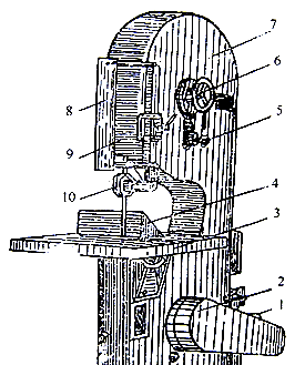 帶鋸機主要由機身、上下鋸輪及鋸輪的升降和傾斜裝置、鋸條張緊裝置、鋸卡裝置、制動裝置等部分組成(見圖1)。