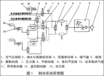 系統原理如圖1所示,腳制動系統由空氣壓縮機1、油水分離器組合閥2、雙通單向閥3、儲氣罐4、梭閥5、腳制動閥6、加力泵13、盤式制動器12等部件組成。發動機驅動空氣壓縮機時,壓縮空氣從空氣壓縮機1進入油水分離器組合閥2,過濾掉空氣中的水分及部分雜質,同時保持系統壓力為0.68-0.7MPa,氣體通過雙通單向閥3進入儲氣罐4。正常行駛及作業時,使用左制動踏板,當踩下左制動踏板時,左、右儲氣罐中的空氣分別進入前后加力泵,推動剎車油沿著管道進入前后驅動橋的盤式制動器12,推動活塞、摩擦片壓向制動盤;當放松制動踏板時,加力泵中的壓縮空氣從制動閥的放氣孔排入大氣,制動狀態解除。