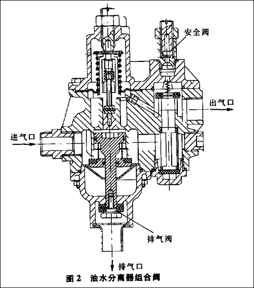 (2)油水分離器組合閥的原因。組合閥有兩種主要功能;一是排氣、油水分離的工輕盈,即當氣體壓力超過0.78MPa時,排氣閥自動打開,同時過濾網下的油、水等雜質自動排出;二是安全保護功能,即當氣壓超過0.85-0.9MPa時安全閥打開,起到安全保護的作用。兩種作用失效,儲氣罐因得不到保護而損壞。
