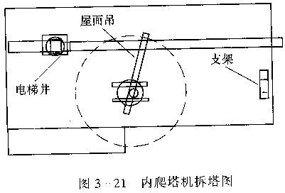 內(nèi)爬式塔機構(gòu)造上雖然是一臺上回轉(zhuǎn)塔機,其安裝過程類似上回轉(zhuǎn)塔機。但安裝好后,它是利用電梯井道和爬梯逐步爬到建筑物頂部的。爬升過程有點類似自升式塔機的頂升,但受力點是爬梯和井道支耳板。當(dāng)建筑物完工以后,就不能按反程序再放下去,而必須在屋面逐步拆除并放下來,這是一個與現(xiàn)場工作條件和采用的輔助設(shè)備有關(guān)的拆卸方法,體現(xiàn)了工程人員的智慧,而沒有完全統(tǒng)一的拆塔模式。這里只能大致介紹一下內(nèi)爬塔機的拆塔過程。假定采用的輔助工具是一臺屋面吊(見圖3—21)。