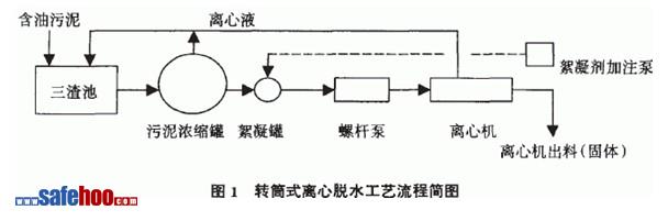 污水處理場產生的含油污泥先進到三渣池進行沉降脫水,濃縮后的含油污泥由泵打入污泥濃縮罐進一步沉降脫水,脫水后污泥由螺桿泵輸送至離心機再次脫水分離。液體(離心液)回到三渣池,離心機出料(固體)運送至堆泥場,污泥干化后外運至廢渣坑。污泥脫水工藝流程如圖1。