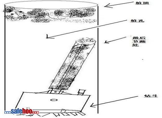 ??????? 旋挖鉆進過程中,當鉆進較深樁基會使用最后一節鉆桿,有時會出現鉆桿斷掉現象但幾率很小,導致余下的鉆桿和鉆斗遺留在空內,其中包括鉆桿質量原因,或地質強度原因,以及操作原因