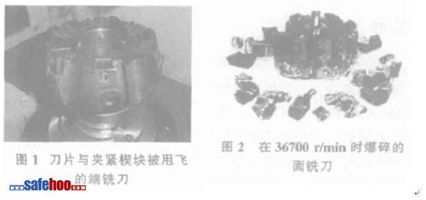 高速切削時, 離心力成為銑刀破壞的主要載荷, 防止離心力造成的破壞關鍵在于刀體的強度是否足夠, 機夾刀的零件夾緊是否可靠。為了能在設計階段就能定量估算出銑刀刀體結構的強度和夾緊的可靠性, 國外已開發出高速銑刀的有限元 ( Finite Element Methods, FEM)模型, 它能夠模擬刀片在刀體刀座里的傾斜、滑動、轉動及螺釘在夾緊時的變形, 計算出不同轉速度下刀片的位移和螺釘受力的大小。據 FEM 計算和試驗, 機夾可轉位銑刀在高速下的失效主要有兩種形式: 一種是由于夾緊刀片的螺釘被子剪斷, 刀片或其它夾緊元件甩飛;另 一 種 是 刀 體 爆 碎 。 如 圖 1 所 示 的 端 銑 刀 ( 直 徑Ф100mm) , 其刀片靠摩擦力夾緊, 在轉速 5000r/min 時其中的一個刀片與夾緊楔塊被甩飛。在多數情況下首先 出 現 的 是 前 一 種 失效, 隨 著 轉 速 進 一 步 提高, 達到刀體強度的臨界值時, 才出現后一種失效即刀體爆碎。圖 2 所示為在 36700 r/min 時 爆 碎 的
