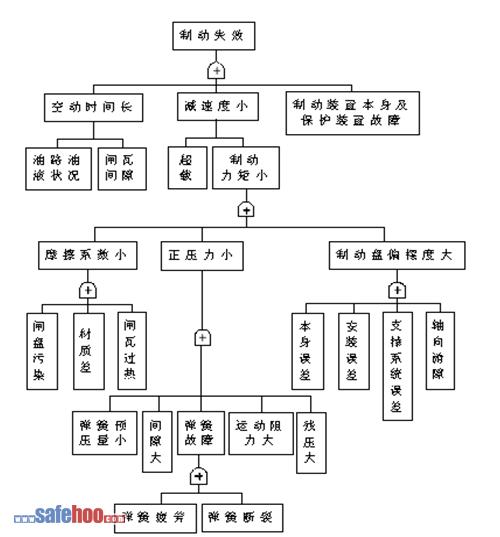 從上述引起盤形閘制動失效的因素可以看出,導(dǎo)致盤形閘制動失效的原因有:一方面是制動力矩過小或過大;另一方面是制動裝置及保護裝置出現(xiàn)故障。制動力矩過小,顯然制動減速度過小,制動距離過大,使提升容器不能在要求的位置上被可靠地閘住;制動力矩過大,通常盤形閘不會馬上失效,但從提升鋼絲繩來看,制動力矩過大,則制動減速度過大,超過《煤礦安全規(guī)程》對制動減速度的要求,使提升鋼絲繩受到的動負荷過大,從而導(dǎo)致斷繩事故,使提升容器墜落。這說明制動力矩過大也會使制動失效。結(jié)合圖1-2事故樹可清楚地對盤形閘制動失效進行分析。