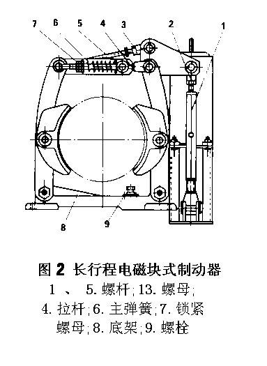 長行程電磁塊式制動器工作時制動力矩穩定,閉合動作較快,其制動力矩可通過調整彈簧的張力進行較為精確的調整,安全性高,在起升機構中應用得比較廣泛。