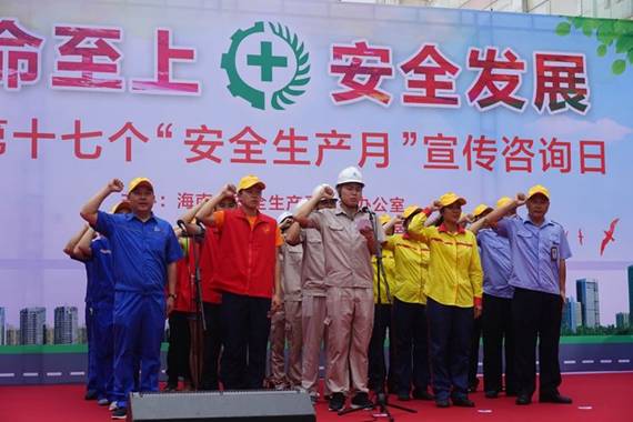 海南省暨海口市安全宣傳咨詢日活動現場,各行各業(yè)勞動者代表在主席臺上進行了安全宣誓,副省長范華平帶頭在“生命至上、安全發(fā)展”簽名墻上簽名。